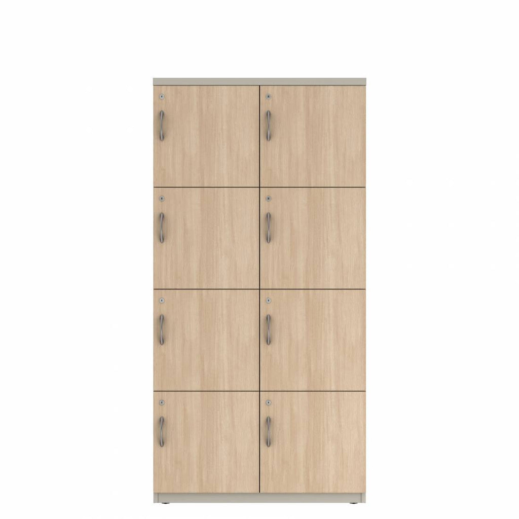 Right-opening laminate doors framed in welded steel. The Prime™ 72"H Double Column Locker with four stacked rows measures 36"W x 18"D and combines a reinforced steel frame with durable laminate doors. Designed for stable use, it incorporates a central locking system to maintain secure and organized storage.