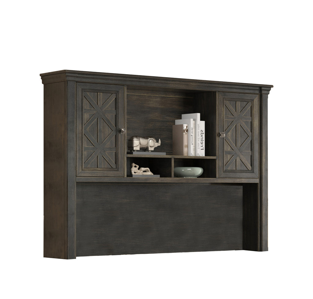 A classic design with a timeworn touch. The Stockton Executive Hutch features a dark chocolate rub-through finish, creating a naturally aged appearance. With two wood doors, adjustable shelves, and an open storage area, the Stockton Executive Hutch provides concealed and accessible storage for an organized workspace.